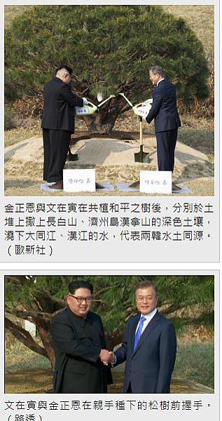 在簽署和平宣言後,文在寅與金正恩展開預訂的植樹儀式,兩人一起共植和平之樹。(路透)