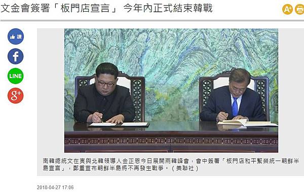 分享文金會簽署「板門店宣言」 今年內正式結束韓戰到Facebook 分享文金會簽署「板門店宣言」 今年內正式結束韓戰到Line 分享文金會簽署「板門店宣言」 今年內正式結束韓戰到Google+