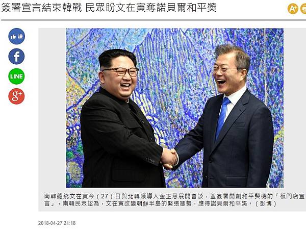 分享簽署宣言結束韓戰 民眾盼文在寅奪諾貝爾和平獎到Facebook 分享簽署宣言結束韓戰 民眾盼文在寅奪諾貝爾和平獎到Line 分享簽署宣言結束韓戰 民眾盼文在寅奪諾貝爾和平獎到Google+