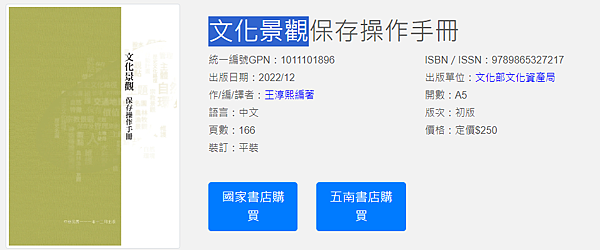 本手冊之出版將提供各縣市主管機關、文化資產專業規劃團隊及文化景觀所有人、使用人與管理人等相關權益關係人了解與參考使用,使第一線行政人員、及執行的專業團隊,在執行文化景觀登錄與保存相關案件時能有所依據,使文化景觀能正確地扮演其在文化資產保護體系中所應有的角色。特別是在文化景觀登錄後,透過保存維護計畫等相關計畫之訂定,與使用人及管理人的合作,確立可行的保存維護方式,促成輔導使用人、所有人、管理人持續維繫文化景觀之文化資產價值。由於文化景觀在概念與操作上,遠較建築物的古蹟與歷史建築複雜與多樣,手冊在編排上包含以基本觀念與登錄行政的「文化景觀保存操作手冊」,及提供深化操作的「文化景觀保存維護專論」兩大部分互相搭配,以滿足不同使用者的運用需求。文化景觀保存操作手冊 - GPI政府出版品資訊網 https://bit.ly/44C2lWi