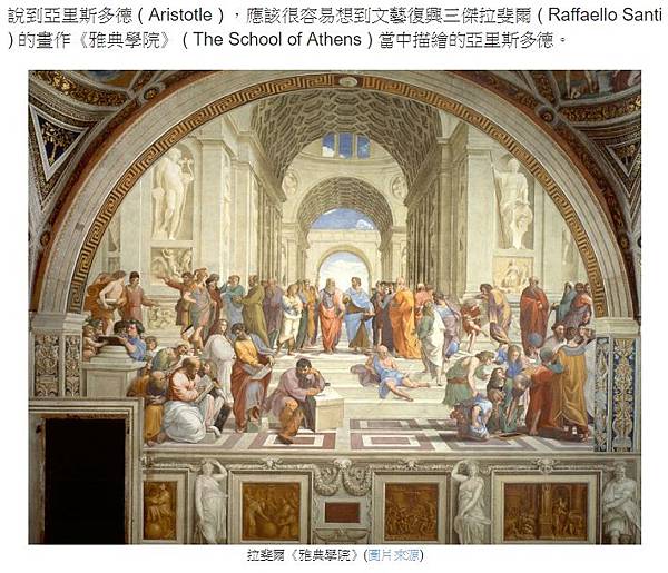 說到亞里斯多德 ( Aristotle ) ,應該很容易想到文藝復興三傑拉斐爾 ( Raffaello Santi ) 的畫作《雅典學院》 ( The School of Athens ) 當中描繪的亞里斯多德。