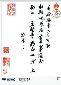 以茶為題材的書法作品稱為茶帖,著名的茶帖有唐懷素《苦筍帖》,宋蘇東坡《啜茶帖》、《季常帖》、《新歲展慶帖》,宋蔡襄《精茶帖》 、《天際烏雲帖》,宋米芾《笤溪帖》,宋趙令疇《賜茶帖》、清金農《玉川子嗜茶帖》等。