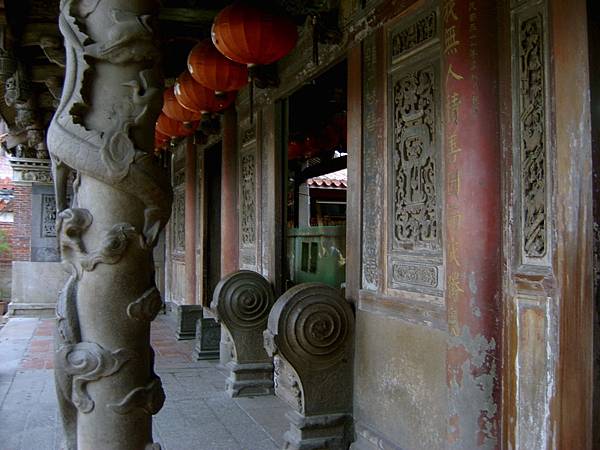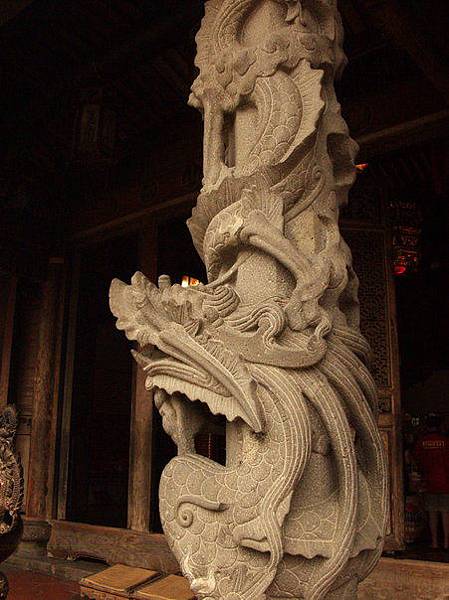 鹿港龍山寺正門前有石雕蟠龍柱一對,是用上好的花崗石雕成升龍與降龍對應的圖象,造成古樸簡潔而渾厚,聽說每根石柱就要雕刻一年以上的時間,是石雕藝術之寶~