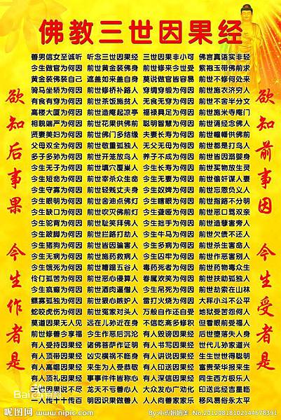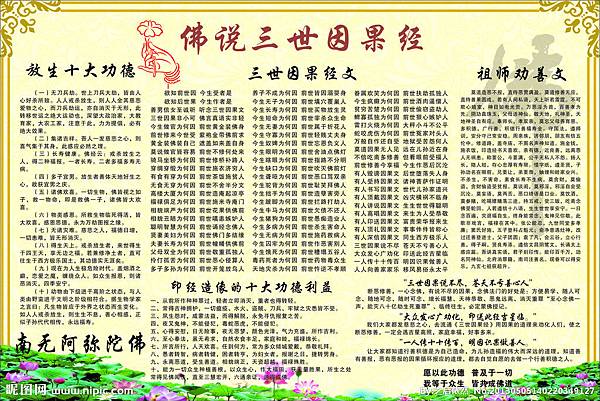 善男信女至誠聽,聽念三世因果經。三世因果非小可,佛言真語實非輕。