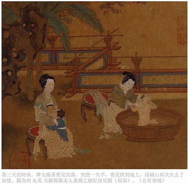第三天的時候,婢女抱著嬰兒洗澡,突然一失手,嬰兒跌到地上,孫峨山再次失去了知覺。圖為明 仇英 天籟閣摹宋人畫冊之嬪妃浴兒圖(局部)。(公有領域)