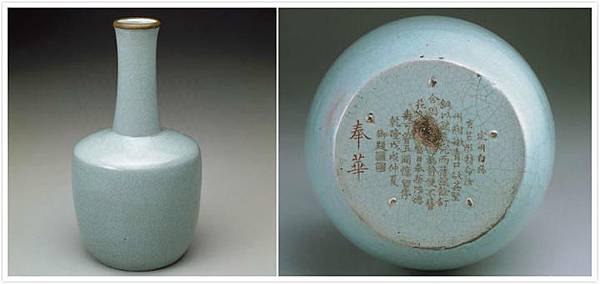 「北宋汝窯青瓷奉華紙槌瓶」底部可見乾隆御製詩,詩曰:
