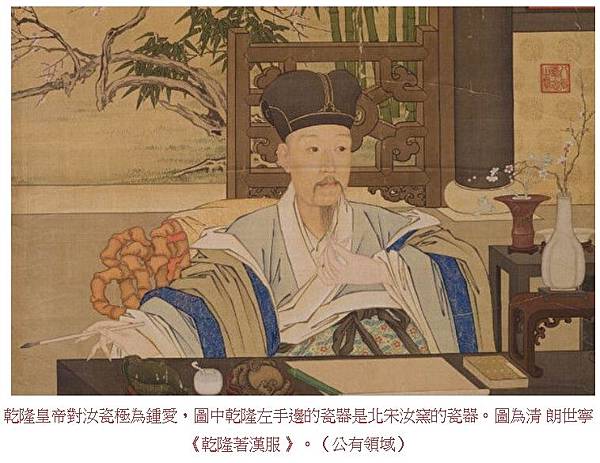 乾隆皇帝對汝瓷極為鍾愛,圖中乾隆左手邊的瓷器是北宋汝窯的瓷器。圖為清 朗世寧《乾隆著漢服 》。(公有領域)