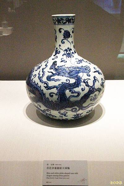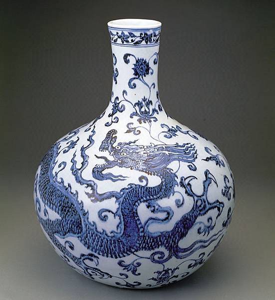 明代早期永樂、宣德時期的青花,使用中東進口的「蘇泥麻青」鈷料描繪圖案,青花的色澤豔麗清新,由於含鐵量比較高,燒成之後,藍色的線條經常泛出鐵質結晶斑,暈染有濃有淡,深入胎骨,渲染自然,就像是一幅水墨畫,給人淋漓盡致、凝厚剛健的感覺。而青花瓷上所描繪的山水、人物、花鳥各類紋飾,展現了高超的繪畫技法,與青花的釉色相得益彰。 這件天球瓶是永樂時期青花瓷器的代表作,形制是永樂官窯所創製。瓶的全身青花濃豔,紋飾設計是它的特徵,上面畫一隻回首的穿蓮三爪行龍,形態健碩,嘴部前伸,鬃毛怒張,威武雄猛,闊步奔行,一幅猛龍穿越蓮花的雄姿。古代將未陞天、行走於地的龍稱為蟠龍,因此這件天球瓶又稱為蟠龍天球瓶。