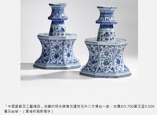 〔記者凃盈如/台北報導〕香港邦瀚斯(Bonhams)將於 2022 年 5 月 29 日「中國瓷器及工藝精品」拍賣,受矚目的拍品為一對來自明代永樂官窯的「青花纏枝花卉八方燭台」。