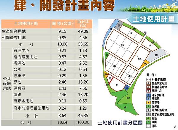 開發案預定109年完工,擬引進在地優勢產業,如電子零組件、電腦光學、運輸及其他低耗能與低用水的綠能產業,開發完成後預估可創造約1200個就業機會。