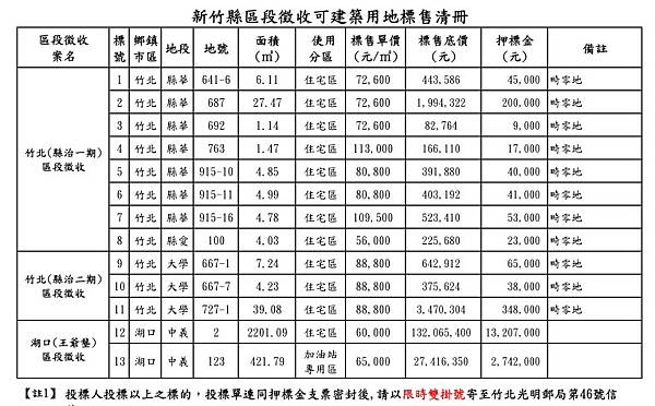 1024-2022本縣各區段徵收案【竹北(縣治一期)、竹北(縣治二期)及湖口(王爺壟)區段徵收】可建築用地公開標售,訂於111年11月2日(星期三)上午9時30分假本府地政處二樓會議室辦理開標作業,有興趣民眾可至縣府地政處服務台洽詢領取投標書類文件,或於網站上自行下載使用公告:本縣各區段徵收可建築用地公開標售,訂於111年11月2日開標 https://bit.ly/3D2od1b