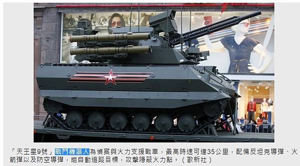 〔即時新聞/綜合報導〕為了慶祝在二次大戰期間擊敗納粹德國,俄羅斯在每年的5月9日都會進行一系列慶祝活動,其中在首都莫斯科紅場舉行的盛大閱兵更是各國矚目的焦點,今年最特別的是首次有軍事機器人加入閱兵的行列,包括「天王星6號」工程機器人和「天王星9號」戰鬥機器人。