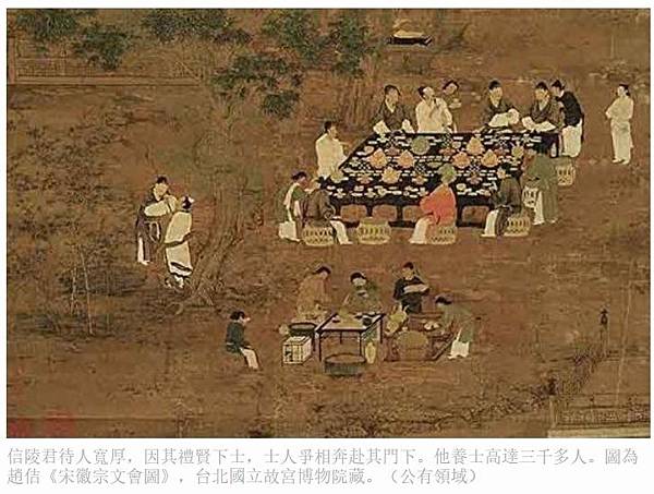 信陵君待人寬厚,因其禮賢下士,士人爭相奔赴其門下。他養士高達三千多人。圖為趙佶《宋徽宗文會圖》,台北國立故宮博物院藏。(公有領域)