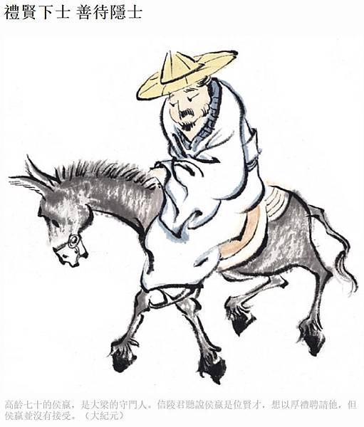 當時,已高齡七十的侯嬴,是大梁的守門人。信陵君聽說侯嬴是位賢才,想以厚禮聘請他,但侯嬴並沒有接受。