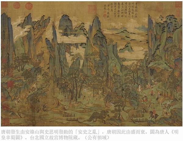 唐朝發生由安祿山與史思明發動的「安史之亂」,唐朝因此由盛而衰。圖為唐人《明皇幸蜀圖》,台北國立故宮博物院藏。(公有領域)