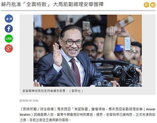 分享蘇丹批准「全面特赦」 大馬前副總理安華獲釋到Facebook 分享蘇丹批准「全面特赦」 大馬前副總理安華獲釋到Line 分享蘇丹批准「全面特赦」 大馬前副總理安華獲釋到Google+