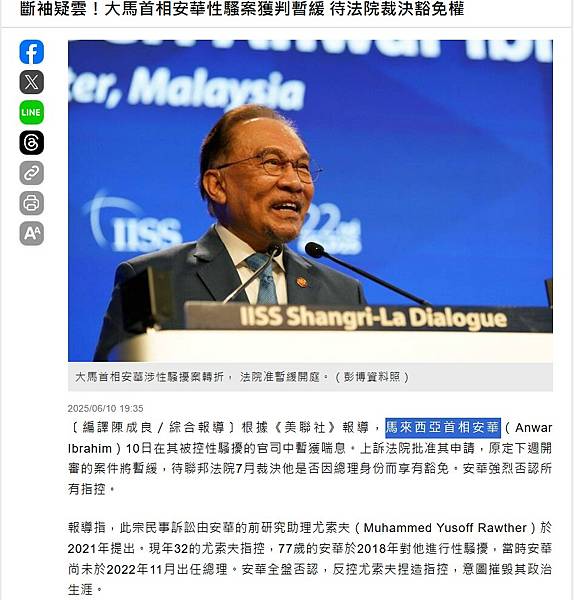 斷袖疑雲!大馬首相安華性騷案獲判暫緩 待法院裁決豁免權 - 國際 - 自由時報電子報
