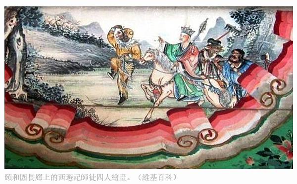頤和園長廊上的西遊記師徒四人繪畫。(維基百科)