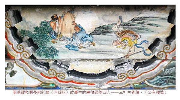 圖為頤和園長廊彩繪圖爲《西遊記》故事中的唐僧師徒四人——路遇紅孩兒。(公有領域)