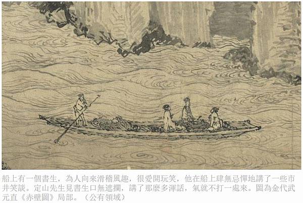 船上有一個書生,為人向來滑稽風趣,很愛開玩笑,他在船上肆無忌憚地講了一些市井笑談。定山先生見書生口無遮攔,講了那麼多渾話,氣就不打一處來。圖為金代武元直《赤壁圖》局部。(公有領域)