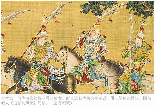 皇帝派一個侍衛當隨侍朝貢的使者,而且這名侍衛大字不識,引起眾臣的驚訝。圖為明人《出警入蹕圖》局部。(公有領域)