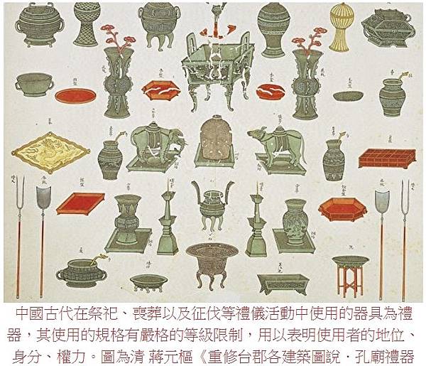 中國古代在祭祀、喪葬以及征伐等禮儀活動中使用的器具為禮器,其使用的規格有嚴格的等級限制,用以表明使用者的地位、身分、權力。圖為清 蔣元樞《重修台郡各建築圖說.孔廟禮器圖》。(公有領域)