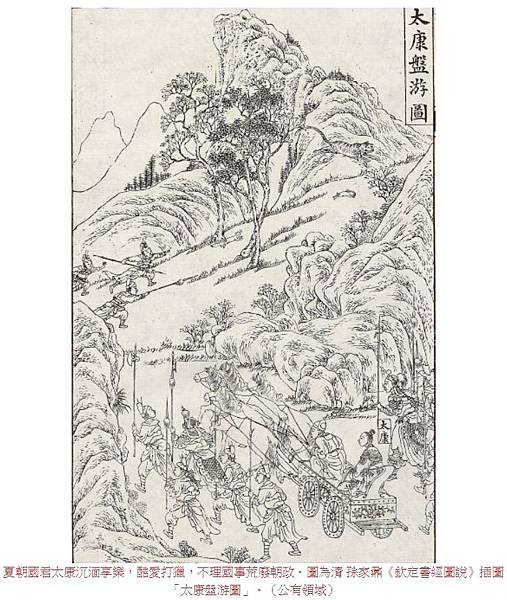 夏朝國君太康沉湎享樂,酷愛打獵,不理國事荒廢朝政。圖為清 孫家鼐《欽定書經圖說》插圖「太康盤游圖」。(公有領域)