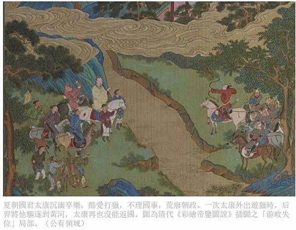 夏朝國君太康沉湎享樂,酷愛打獵,不理國事,荒廢朝政。一次太康外出遊獵時,后羿將他驅逐到黃河,太康再也沒能返國。圖為清代《彩繪帝鑒圖說》插圖之「游畋失位」局部。(公有領域)
