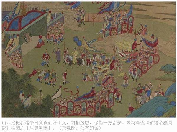 山西巡檢郭進平日負責訓練士兵,緝捕盜賊,保衛一方治安。圖為清代《彩繪帝鑒圖說》插圖之「屈尊勞將」。(示意圖,公有領域)