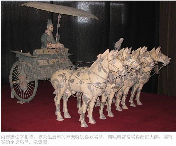 丙吉擔任宰相時,專為他駕車的車夫特別喜歡喝酒,閒暇時常常喝得酩酊大醉。圖為秦始皇兵馬俑。示意圖。