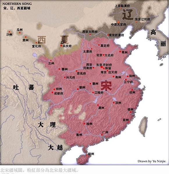 北宋疆域圖。粉紅部分為北宋最大疆域。