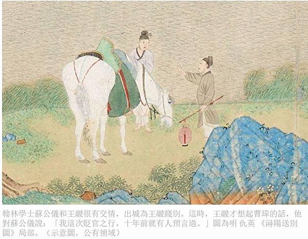 翰林學士蘇公儀和王鬷很有交情,出城為王鬷餞別。這時,王鬷才想起曹瑋的話,他對蘇公儀說:「我這次貶官之行,十年前就有人預言過。」圖為明 仇英 《潯陽送別圖》局部。(示意圖,公有領域)
