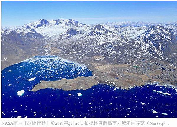 NASA藉由「冰橋行動」於2018年4月26日拍攝格陵蘭島南方城鎮納薩克(Narsaq)。(NASA)