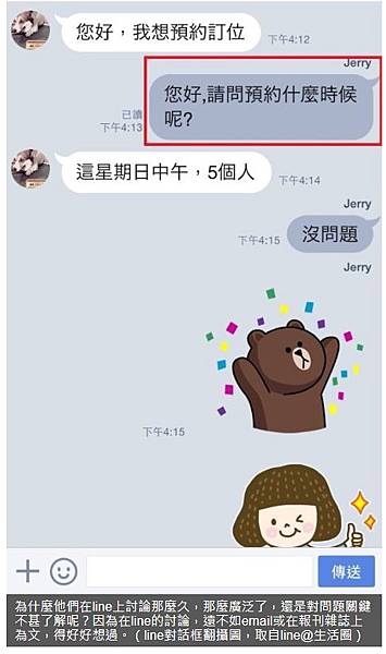 line討論侵奪大家休息時間。如以學校場域為例。學校校長和主任,為了表示公誠勤樸的樣子,幾乎都是隨看隨回。那他們何時休息呢?何時有大段時間好好思考呢?連帶的,班級導師也隨看隨回家長。不回的,可能就視為不用心,不夠努力,在積極處理學生問題不夠認真。可是,現在契約平等時代,每個人都有不容侵犯的私領域,不應該有那種隨Call隨到的血汗工作存在的。