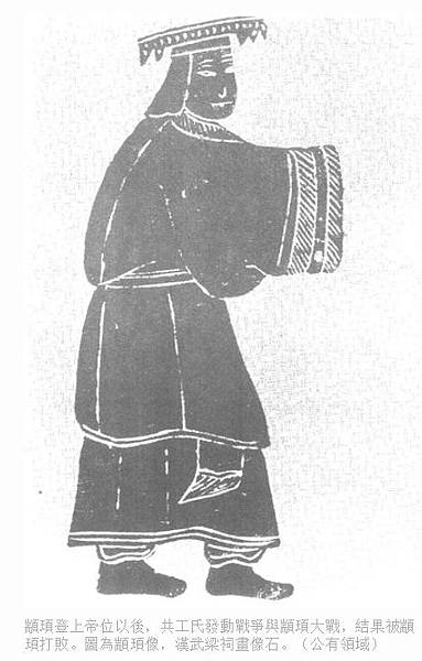 顓頊登上帝位以後,共工氏發動戰爭與顓頊大戰,結果被顓頊打敗。圖為顓頊像,漢武梁祠畫像石。(公有領域)
