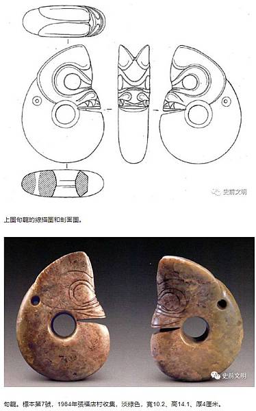 1)從考古學上講,玉石龍這個器物實際上是個玦,考古發現證明了,在遼西地區發現了8200年的玉玦,是興隆窪文化出土的,出土時玉玦是在墓主人的耳朵上的,是一對耳環。接下來過了兩三千年,發展到紅山文化的時候,這種玉玦的一側就被雕琢出來像豬的頭一樣的形象,最早的時候稱為玉豬龍,身姿呈捲曲狀。