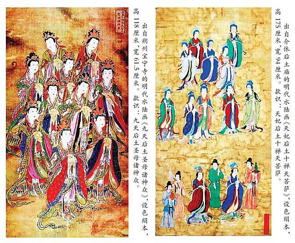明代水陸畫《九天后土聖母諸神眾》和《天妃后土十禪天菩薩》珠聯璧合交相輝映,就是這種融合的鮮活證據,文化藝術價值意義巨大,“給中國人的宗教信仰、哲學觀念、文學藝術、禮儀習俗等留下了深刻影響”。