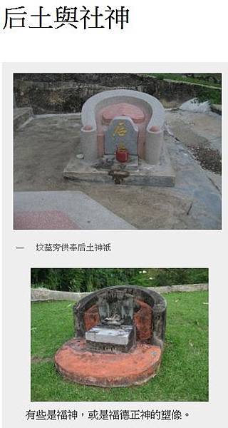 為何台灣常見后土在墓園的一旁?因為“楚辭”曾說地下幽冥是后土掌管,門口守衛是土伯,到了明朝以後后土成為民間墓園的守護神,而漢人移民開墾台灣始自明清,也就繼承這項傳統。