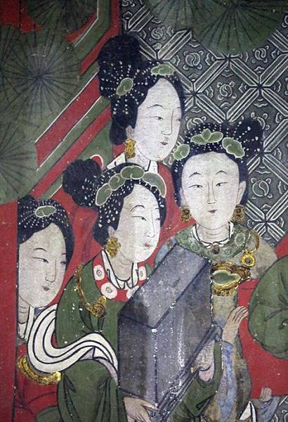 北壁《燕樂圖》是聖母后宮生活場景。畫面上亭台樓閣之間,一組行進中的樂女列隊,三人組合持樂器橫笛、琵琶和拍板,彈琵琶者微側頭,體態修長。一側吹笛者,身體微傾,好似在傾聽琵琶節律。拍板者躬身拖拍,極力與笛、琵琶的節奏合拍。其側的五位宮女,分別捧古琴、笙、阮咸等,身姿婀娜,秀麗挺拔。樂隊邊是四位捧圍棋、金盞、香爐等物的宮女。右角亭內的備食宮女在燒茶溫酒,洗滌碗盞。正中木龕兩側宮女掌琴、棋、書、畫文房四寶。