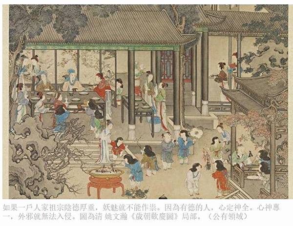 如果一戶人家祖宗陰德厚重,妖魅就不能作祟。因為有德的人,心定神全。心神專一,外邪就無法入侵。圖為清 姚文瀚《歲朝歡慶圖》局部。(公有領域)