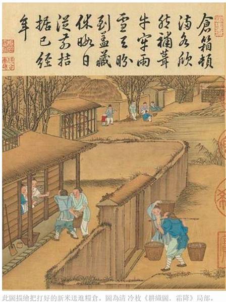 此圖描繪把打好的新米送進糧倉。圖為清 冷枚《耕織圖.霜降》局部。(公有領域)
