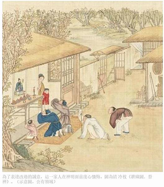 為了表達改過的誠意,這一家人在神明面前虔心懺悔。圖為清 冷枚《耕織圖.祭神》。(示意圖,公有領域)