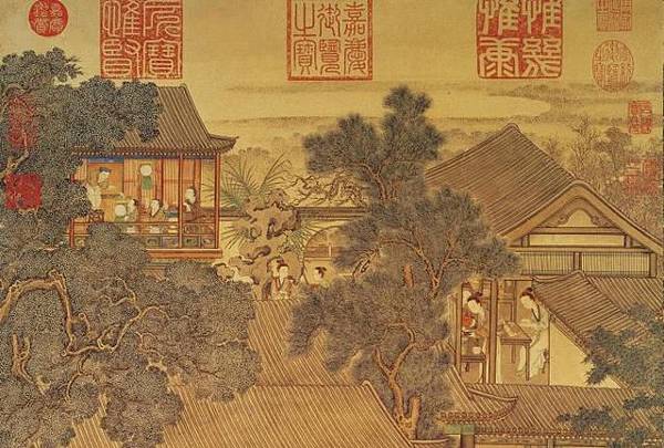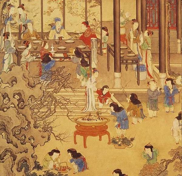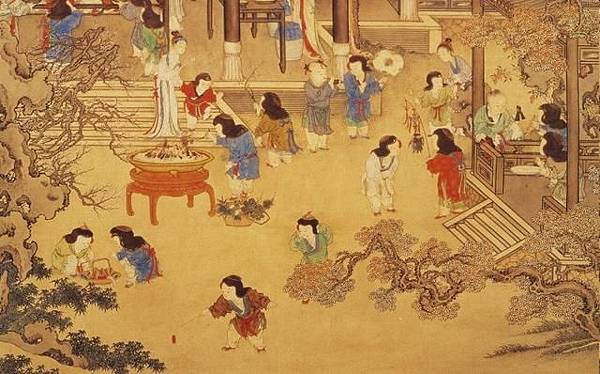 姚文瀚,乾隆年間(西元一七三六至一七九五年)以畫供奉內廷,善於畫佛道人物,生卒年和里籍都待考。 本幅畫過年時的情景,小孩們在庭前遊戲著,老人們很高興的在廳堂上聊天,婦女們在廚房裡忙碌著調理酒食,家中的僮僕,也攀高下低的忙著張燈結綵,全家人歡樂團聚,同來慶賀佳節。