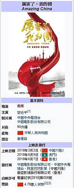 《厲害了,我的國》(英語:Amazing China),是一部以央視的六集紀錄片《輝煌中國》為基礎剪輯製作的紀錄電影,電影由中國中央電視台、中國電影股份有限公司聯合出品,於2018年3月2日在中華人民共和國各大院線電影院上映[4]。該片記錄了2012年中共十八大以來,在中共中央總書記習近平的領導的中國共產黨帶領中國所取得的成績[5]。