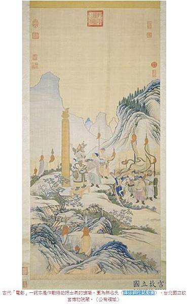 古代「電影」一詞本是作戰時助振士氣的旗幟。圖為無名氏《緙絲銅柱銘勳圖》,台北國立故宮博物院藏。(公有領域)