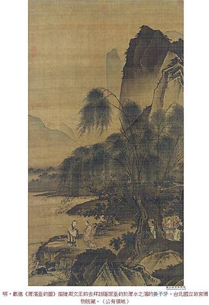 明‧戴進《渭濱垂釣圖》描繪周文王前去拜訪隱居垂釣於渭水之濱的姜子牙。台北國立故宮博物院藏。(公有領域)