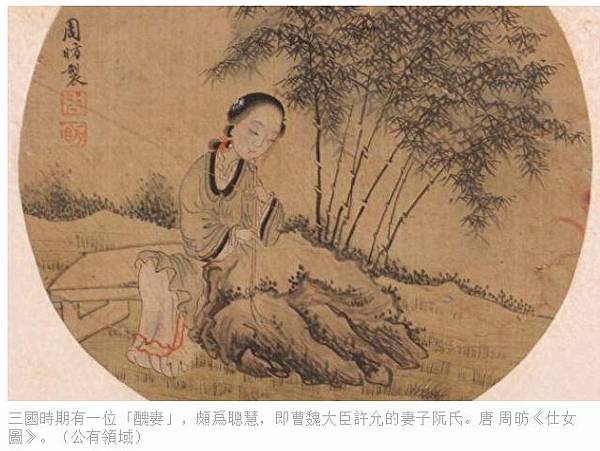 三國時期有一位「醜妻」,頗爲聰慧,即曹魏大臣許允的妻子阮氏。唐 周昉《仕女圖》。(公有領域)