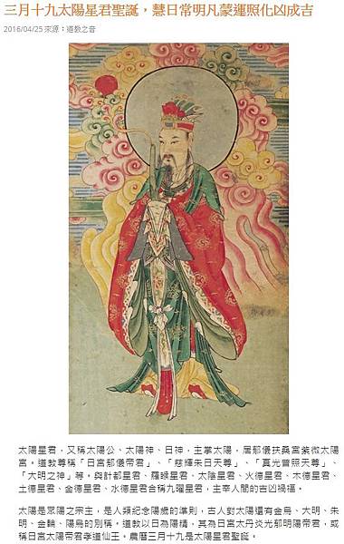 註: 太陽星君聖誕拜祭方式太陽星君坊間又尊稱[太陽公].而鸞門則尊為[日宮太陽帝君].係眾陽之宗.紀歲之基準也.依據史例記載:古代祭祀太陽星君時.係由天子或王侯親自主持.後隨時代之變遷.民間開始衍為風尚.拜祭太陽星君聖誕.因係太極界神祇.依道教科儀需以素食為主.供品六至八齋食(金針.木耳.香菇.桂圓.菜心.豌豆或麵筋.豆干).以及果品.紅龜粿.發粿和壽麵(桃).清茶.鮮花.紅燭.金紙(天金.壽金.篙錢.刈金(九金).福金).