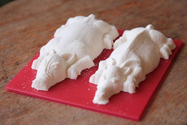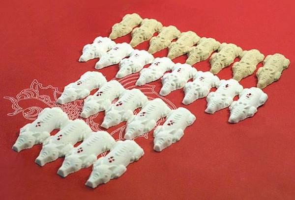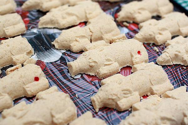 台南寶華香餅舖用傳統綠豆糕做的九豬和鹹糕仔做的十六羊了,此家正確位置在水仙宮的右邊..也算是很老的餠舖太陽公生是府城特有的民間信仰祭儀,祭品「九豬十六羊」更隱含「反清復明」的歷史意涵,其中,尖嘴代表羊,寬口的是豬。