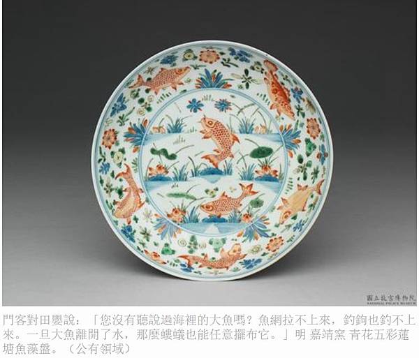 門客對田嬰說:「您沒有聽說過海裡的大魚嗎?魚網拉不上來,釣鉤也釣不上來。一旦大魚離開了水,那麼螻蟻也能任意擺布它。」明 嘉靖窯 青花五彩蓮塘魚藻盤。(公有領域)